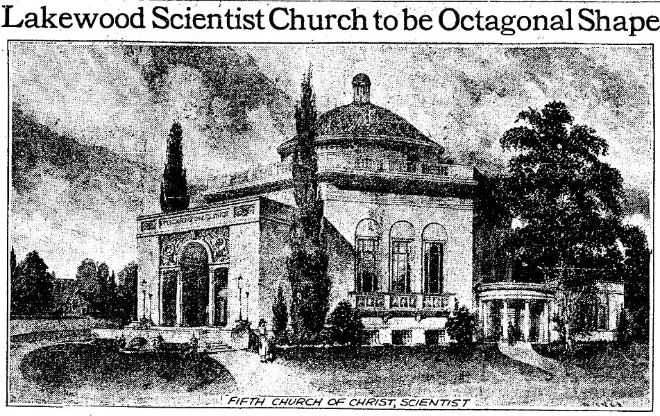 In its June 26, 1926 edition, the Cleveland Plain Dealer gushed about the proposed new Fifth Church of Christ, Scientist, on the corner of Lake Avenue and West 117th Street. The paper noted that talented local architect Frank W. Bail had designed the interesting new church. (The Plain Dealer, however, incorrectly stated that the church would be located in Lakewood.)