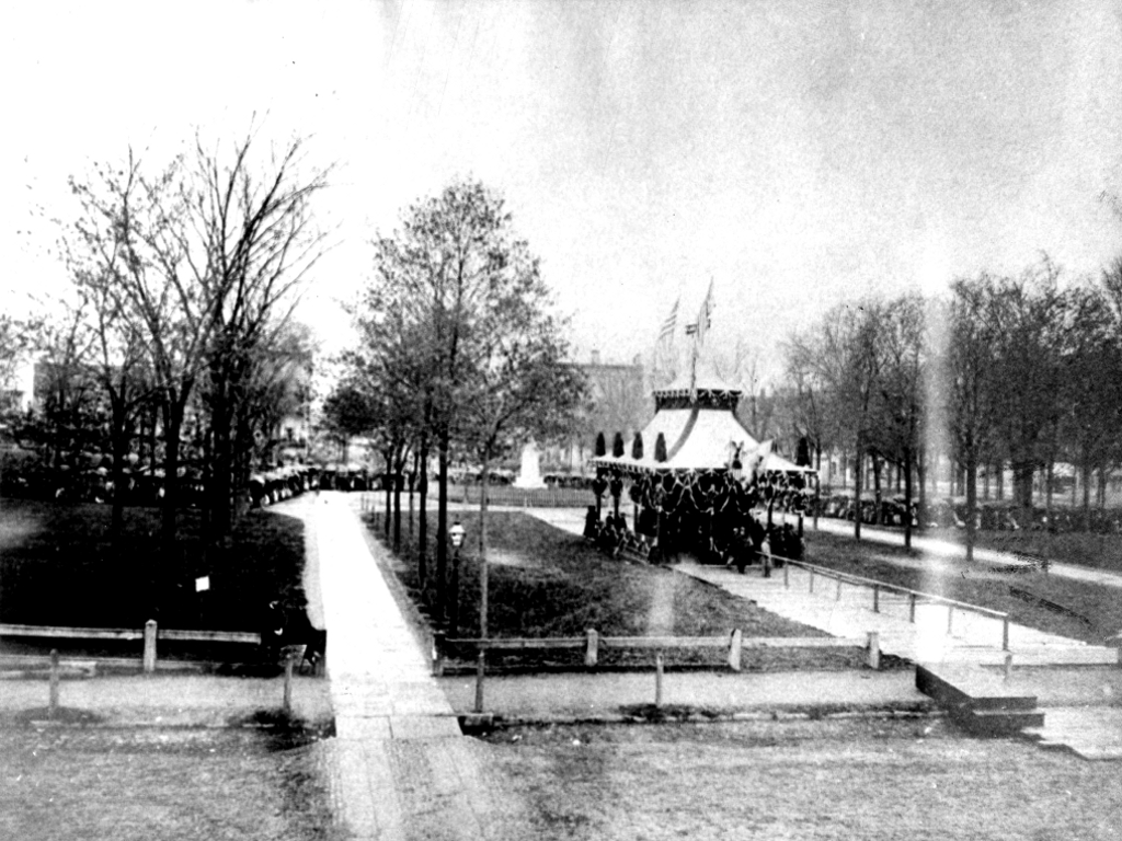 The catafalque (the support structure that coffins rest upon) is placed in Cleveland's Public Square during the memorial service for President Abraham Lincoln in April 1865. The Lincoln Catafalque has been used for all those who have lain in state in the Capitol Rotunda since Lincoln's death. | Date: April 1865 | Source: Cleveland Memory Project, Cleveland State University Library Special CollectionsDownload Original File