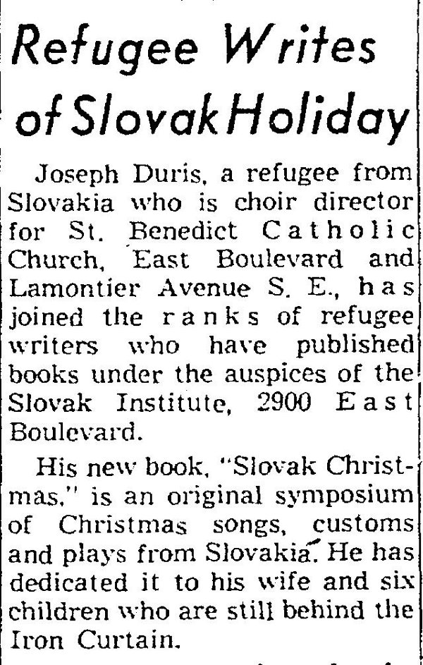 For most of the four decades of communist rule in Czechoslovakia (1948-1989), the Slovak Institute was an important publisher of books about Slovak history and culture written by Slovak refugees from that country, many living here in Cleveland. Books like the one featured in the above article from the December 25, 1960 edition of the Plain Dealer were printed here in America and then smuggled into communist Czechoslovakia in a number of ways--often by American friends and relatives visiting the country.
