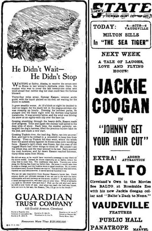 Following the successful serum relay, a Hollywood producer quickly contacted Leonhard Seppala to capitalize on Balto's celebrity. With six additional dogs from the sled team, the dogs were featured in a movie and sent on a promotional tour across the United States. | Creator: Guardian Trust Company | Date: 1925Download Original File
