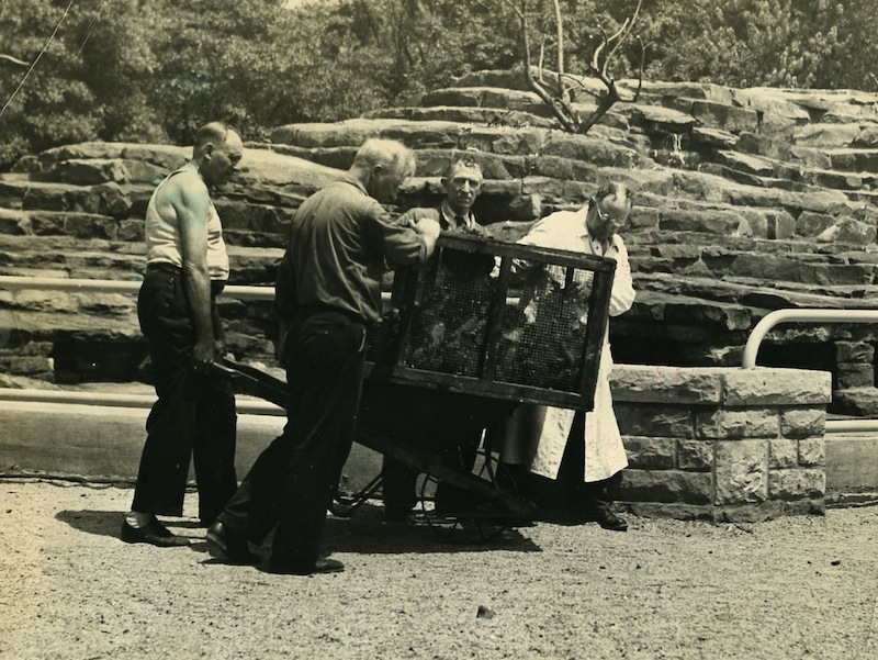 Nathan Dauby, manager of the May Company, presented the City of Cleveland with a colony of 150 monkeys from Africa following the completion of Monkey Island in 1936. To save on the cost of feeding the island's many inhabitants during an economic crisis, the monkeys were sold by the city in the fall and replaced by a new colony each spring. | Source: Images courtesy of the Cleveland Metroparks ZooDownload Original File