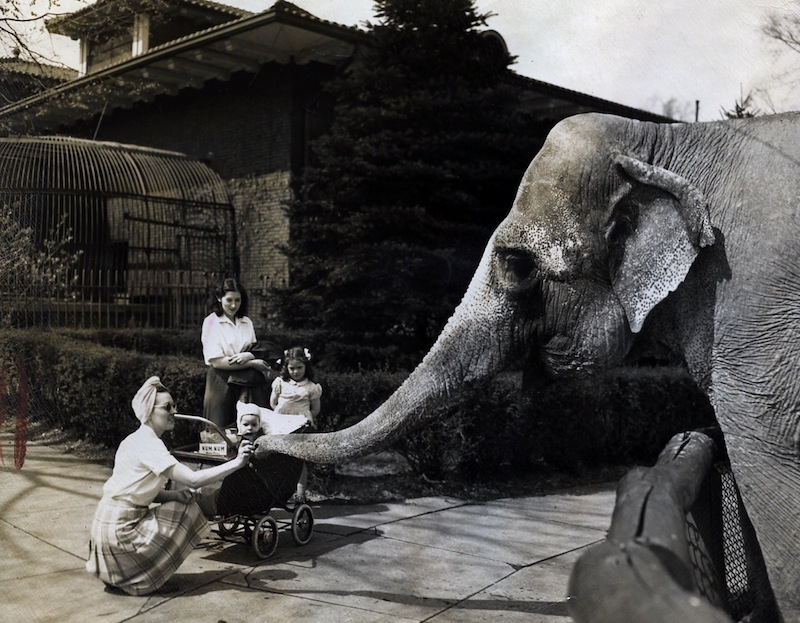 Pictured, Frieda the elephant is being fed "num-nums" outside the Animal House. While the indiscriminate tossing of handouts to zoo animals by visitors was always discouraged at the Cleveland Zoological Park, the feeding times of cat animals, sea lions and penguins were daily highlights during the 1950s. | Source: Image courtesy of Cleveland Metroparks ZooDownload Original File
