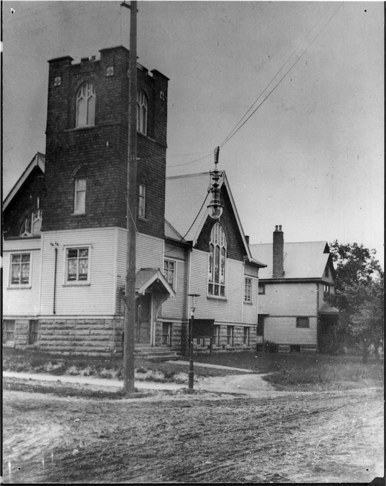 Superior Road was unpaved at the time of this early photograph of the church. Note the early streetlight at center. | Source: City of Cleveland Heights. Cleveland Heights Historical Center at Superior SchoolhouseDownload Original File