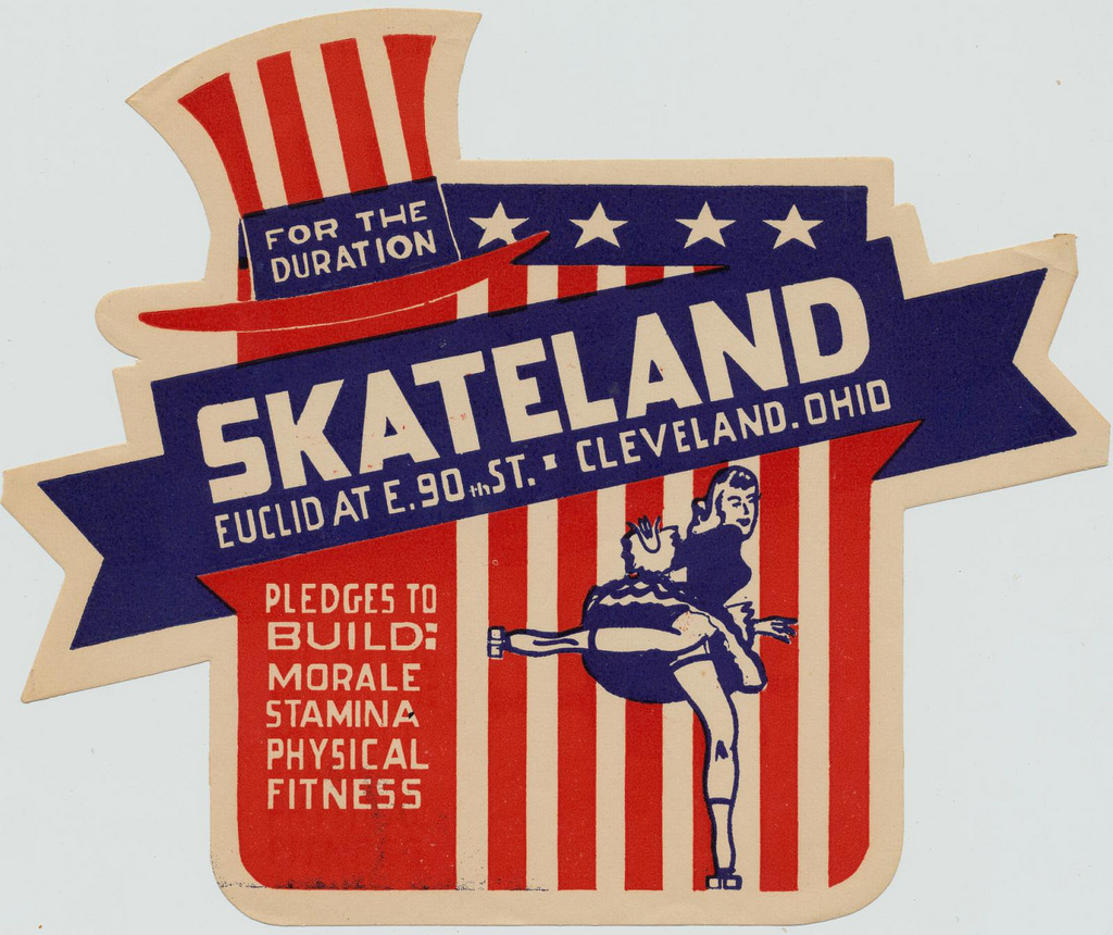 Skateland, once located at 9001 Euclid Avenue, is now the site of a Cleveland Clinic parking garage. From its red, white, blue colors, stars-and-stripes design, and Uncle Sam's hat to its motto "to build morale, stamina, physical fitness," this Skateland decal exudes American patriotism. The top hat's statement "For the Duration" makes clear that this decal was issued during World War II. | Source: Jordan SmithDownload Original File