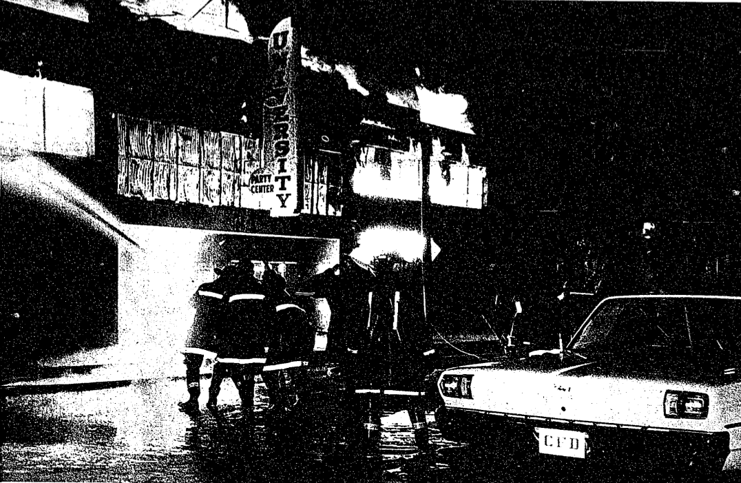 In this photo in the Call & Post, dated July 30, 1966, firefighters battle the blazes set during the convulsive Hough Uprising. The Pla-Mor, which had recently undergone renovations, including a refinished rink floor, was known as University Party Center. This recreation hub of the eastern end of the Cedar-Central neighborhood was a total loss. | Date: July 30, 1966 | Source: Call & PostDownload Original File