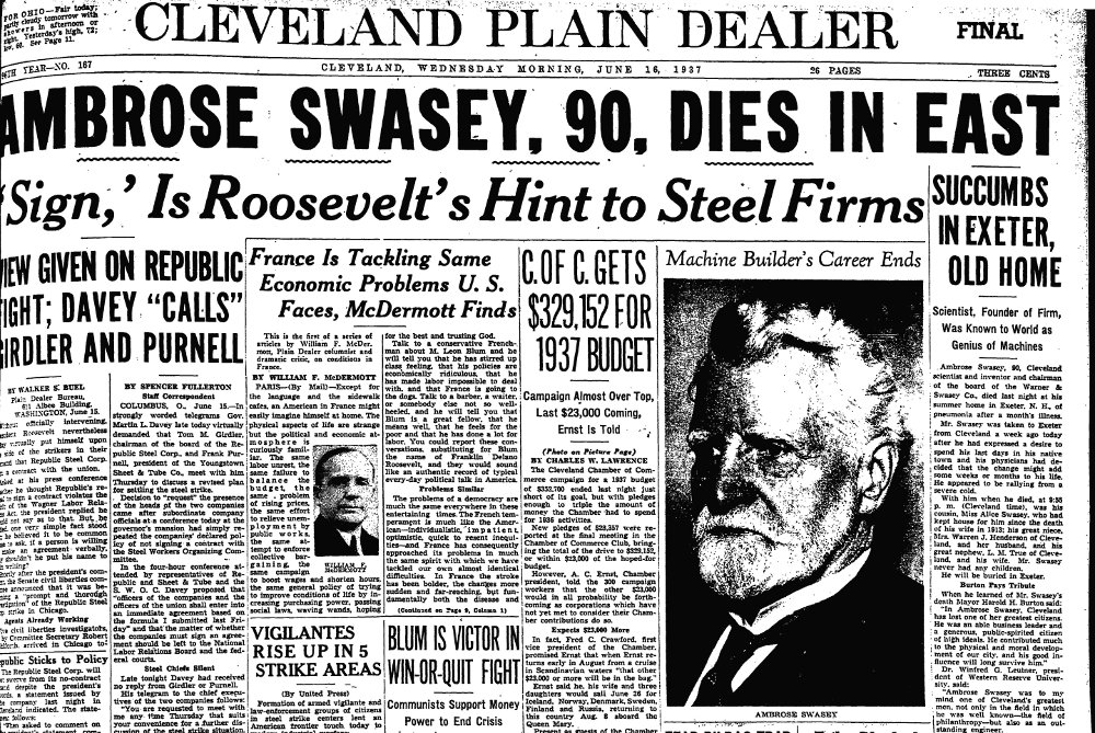 This headline story from the June 13, 1937 edition of the Cleveland Plain Dealer graphically demonstrates the the importance of Ambrose Swasey to the Cleveland business community in the early twentieth century. At the time of his death, Cleveland mayor Harold Burton called him one of the city's "greatest citizens."