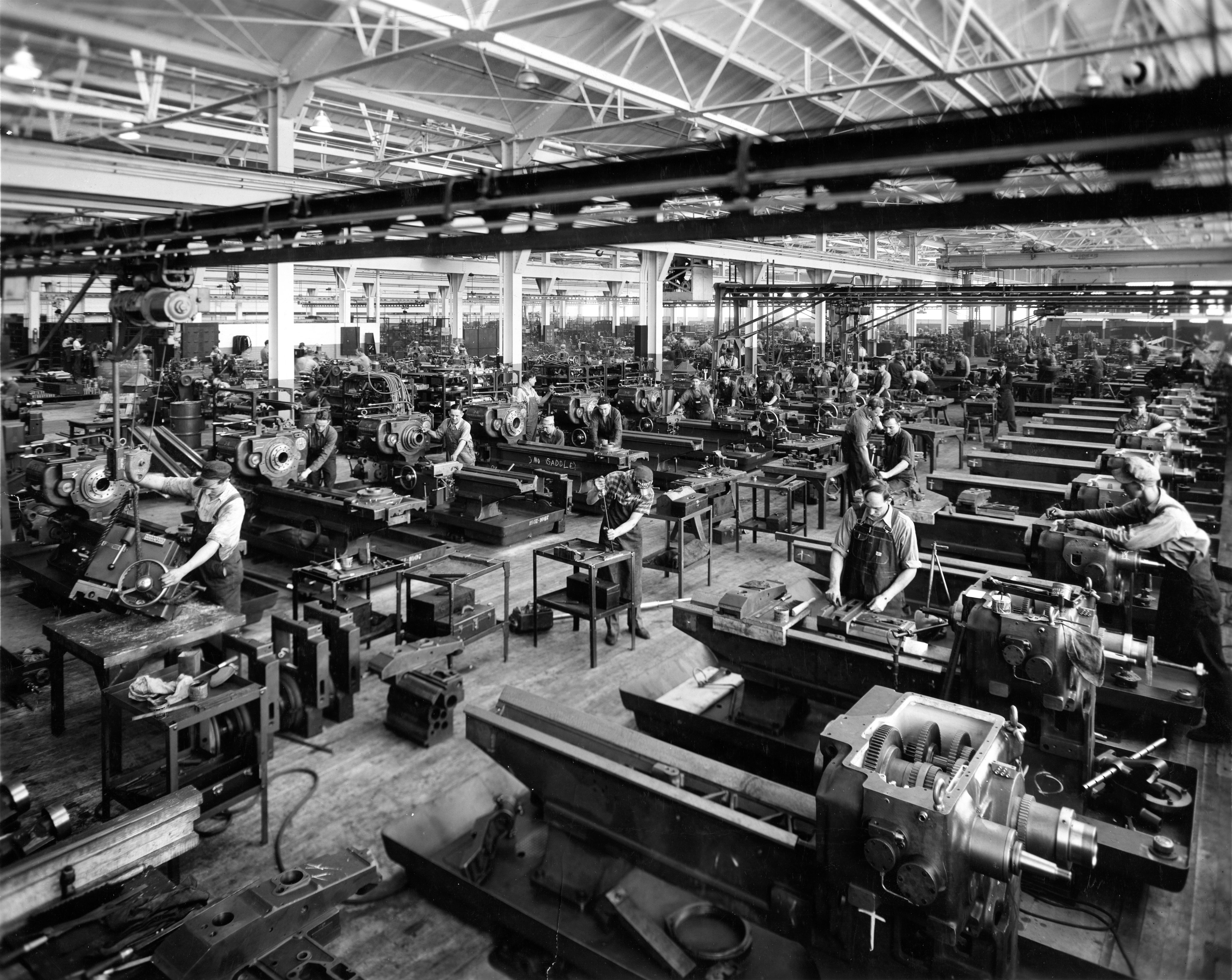 The above photo shot in 1940 shows the size of the machine shop at Warner & Swasey on the eve of the United States' entry into World War II. During the War, machinists like these shown in the photo manufactured parts for the planes, ships, and tanks that helped the Allies win the war.