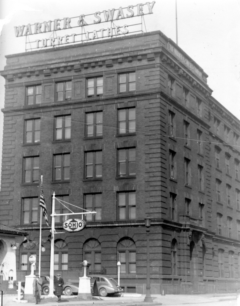 A view of the Warner & Swasey building circa 1941 from the west shows the company's rooftop scaffold sign advertising not only the company's name but also its primary manufactured product. A turret lathe is a machine that repetitively produces metal parts in multiple cutting operations that do not need to be interrupted for the purpose of performing intermediary setup tasks.