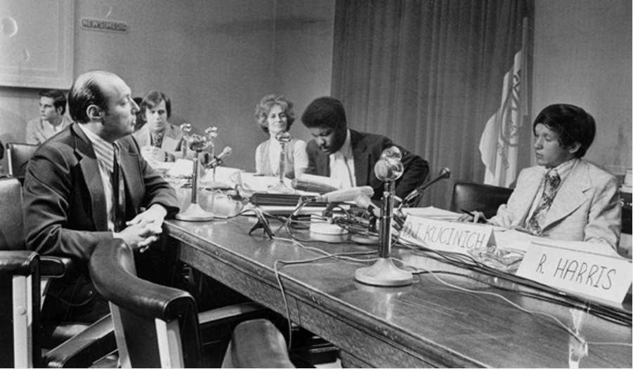 Councilman Dennis Kucinich, right, listens to testimony about the proposed Lake Erie international jetport. Testifying, at left, is Dr. David Gitlin, a Cleveland-area physician and environmentalist. | Date: 1972 | Source: Cleveland State University. Michael Schwartz Library. Special Collections. Cleveland Memory Project.Download Original File