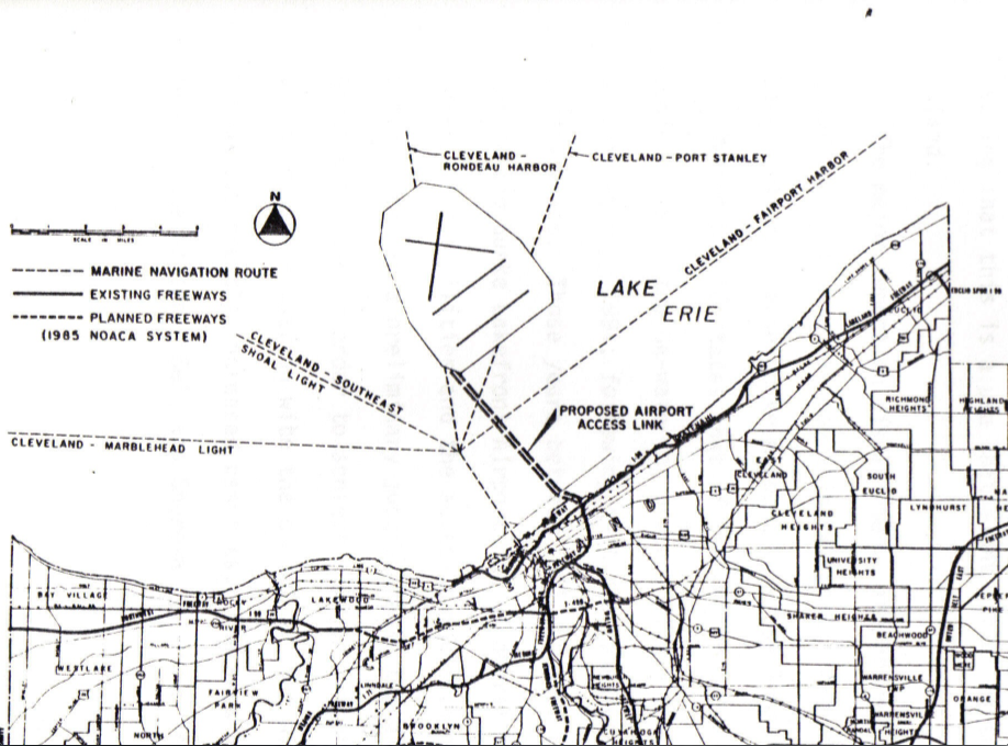 Map depicting the proposed location of the Lake Erie International Jetport offshore with access bridges. To reach the jetport, the Innerbelt would be extended into the lake and RTA would provide access as well. If the jetport had been built, it would have been the largest island in Lake Erie. | Source: Cuyahoga County Archives. NOACA Collection, Box 9, Folder "Preliminary Draft of Final Report 18, Exhibit 20."Download Original File