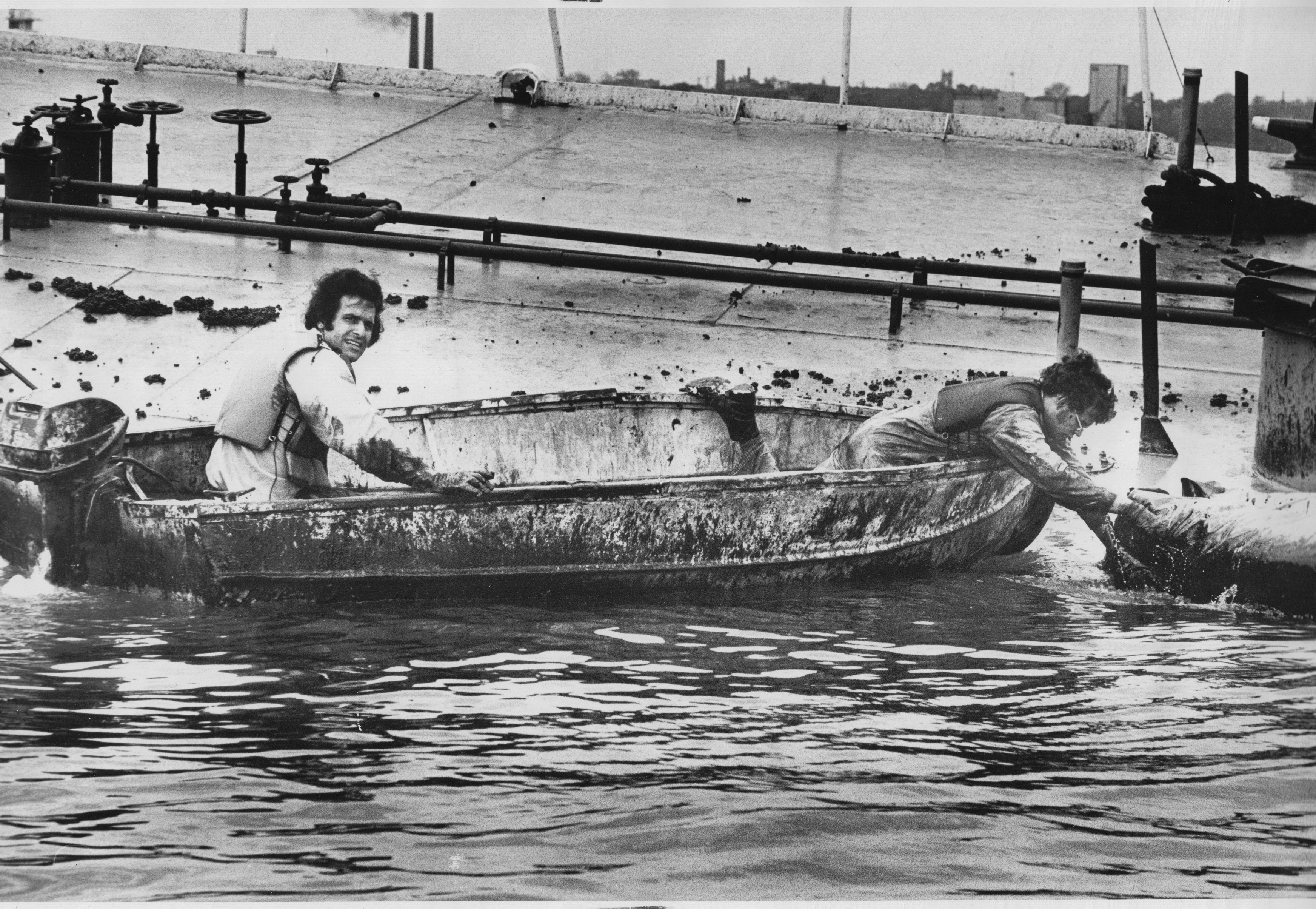 Two men wearing life jackets on a small boat on Lake Erie. Both the boat and the men are covered in oil polluting Lake Erie. | Creator: Tim Culek | Date: May 24, 1976 | Source: Cleveland Memory Project, Cleveland State University Library Special CollectionsDownload Original File