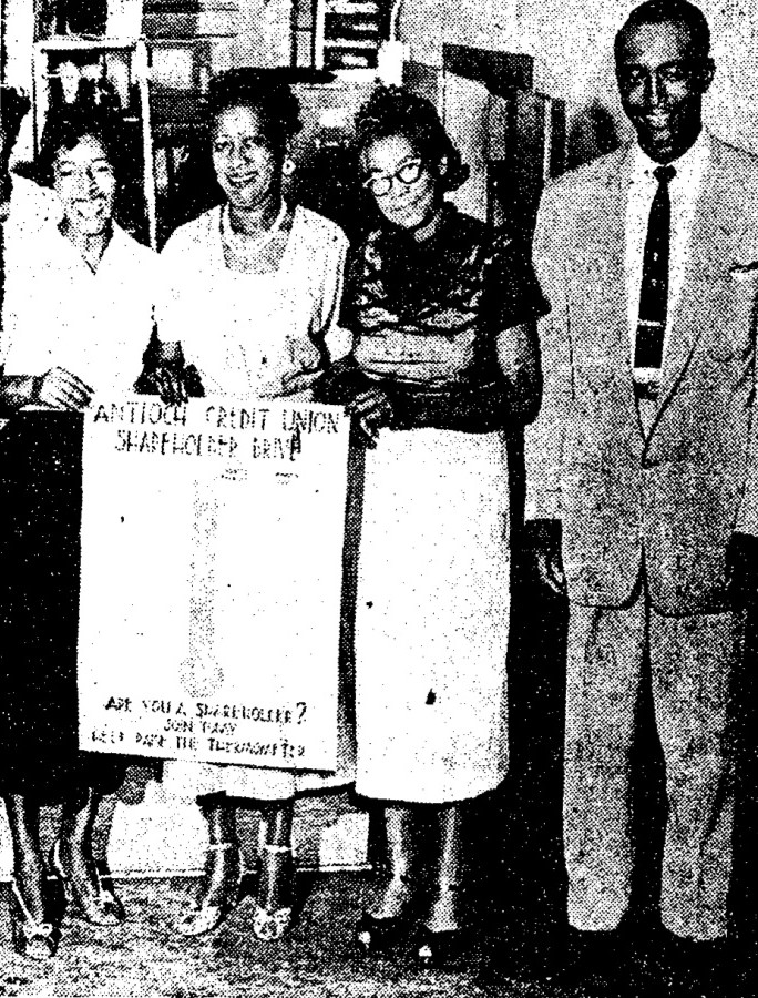 These four individuals representing the 881 shareholders in the Antioch Credit Union are posing for this photograph following the announcement that the union had surpassed the $100,000 mark in assets. At the time of that this photo was taken the credit union had only been in existence for eight years, beginning with $147 in assets in 1947.