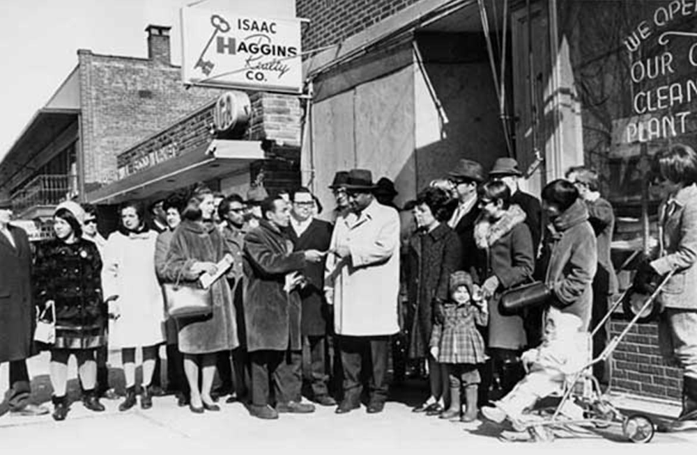 Haggins outside of his destroyed real estate office on North Taylor Road. It was bombed as an act of racial violence. Here Haggins receives an outpouring of community support, which emboldened him to continue his business of assisting people in buying homes regardless of their race. | Source: Cleveland State University. Special Collections. Cleveland Memory Project.Download Original File