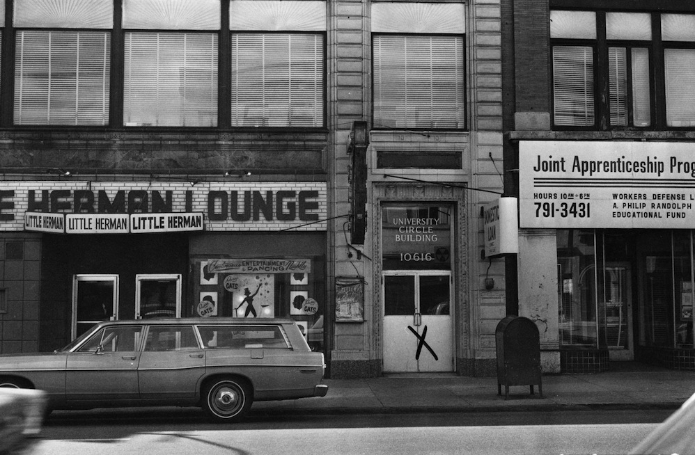 Home to doctors,' dentists,' and attorneys' offices on the second floor into the 1950s-60s, the University Circle Building, shown here in the late 1960s, would soon become the headquarters for Winston Willis's University Circle Properties Development Inc. After the 105th-Euclid Association, a white-dominated booster organization, failed to revitalize the city's "second downtown," suburbanites largely abandoned the area. Note the Joint Apprenticeship Program sign, which also calls attention to a job-training initiative spearheaded by the Workers Defense League (a socialist labor rights organization) and A. Philip Randolph Educational Fund, which was part of the civil rights leader's larger campaign to unite civil rights and labor activism following passage of the 1965 Voting Rights Act. | Date: 1968 | Source: Cleveland Public Library Photograph CollectionDownload Original File