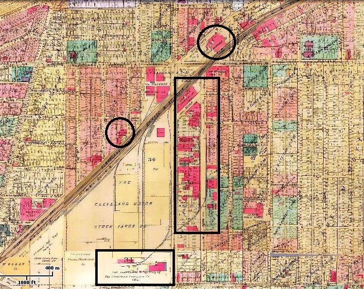 This 1922 Cleveland Plat Book graphically shows how the packing houses (outlined in black) surrounded the Cleveland Union Stockyards--the yellow area in the middle of the plat map. The thick brown line above the Stockyards, transecting the map from the lower left to upper right, is the Big Four Railroad line.