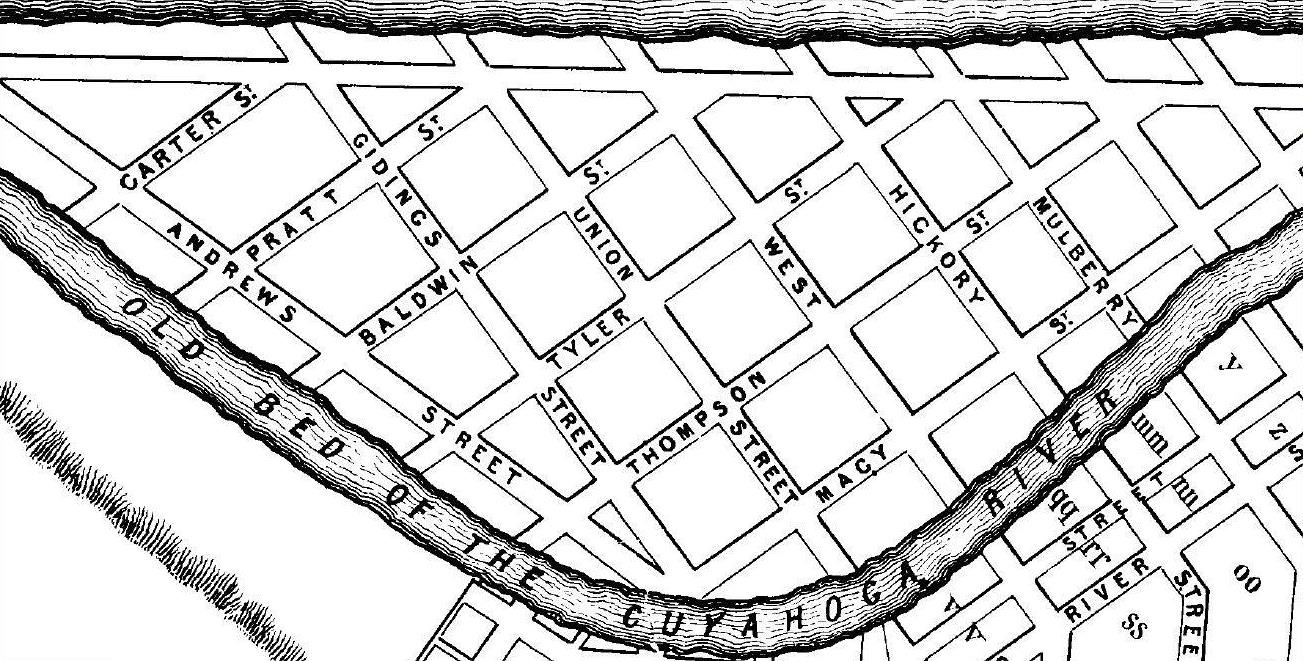 The land north of the Old River Bed of the Cuyahoga River has long been known to Clevelanders as Whiskey Island. In 1835, Ahaz Merchant surveyed the Lorenzo Carter farm for the Buffalo Land Company and noted on his map the names of the streets that were proposed for Whiskey Island. Many of the streets were to be named after the investors themselves, including, in addition to Benjamin F. Tyler, John B. Macy, Sheldon Thompson, Norman C. Baldwin, Hiram Pratt, Major Andre Andrews, and Charles M. Giddings (mispelled as "Gidings").
