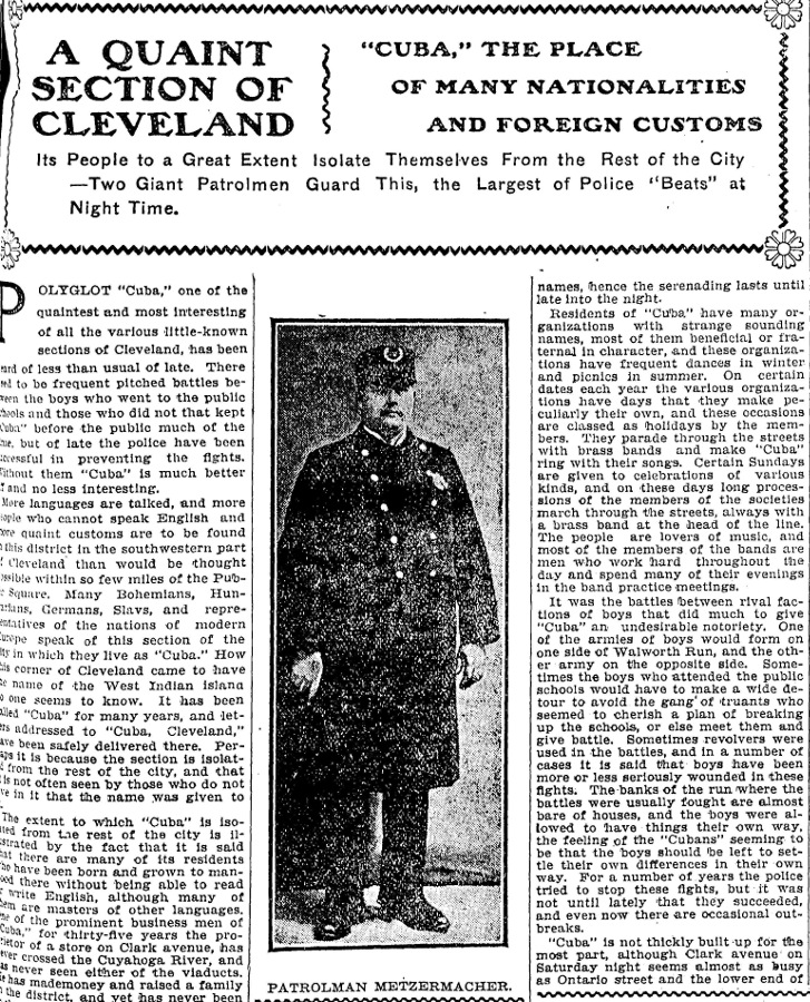 As the above article from the December 29, 1901, Cleveland Leader suggests, the Isle of Cuba was still a tough place to live or work in at the turn of the twentieth century. The Cleveland police department assigned two of its most physically intimidating officers (including Officer Metzermacher shown above) to walk the beat in this neighborhood.