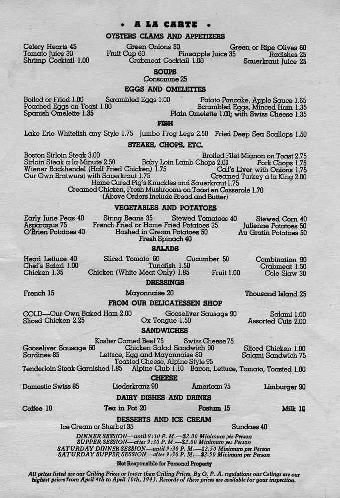 If home cured pig's knuckles, ox tongue, jumbo frog legs, or goose liver sausage felt too risky, you could always turn to the sirloin steak or Lake Erie whitefish. Note the Office of Price Administration (OPA) statement at the bottom, which promised compliance with OPA-mandated price ceilings on commodities during World War II. | Date: 1943 | Source: Cleveland Memory, Cleveland State University Library Special CollectionsDownload Original File