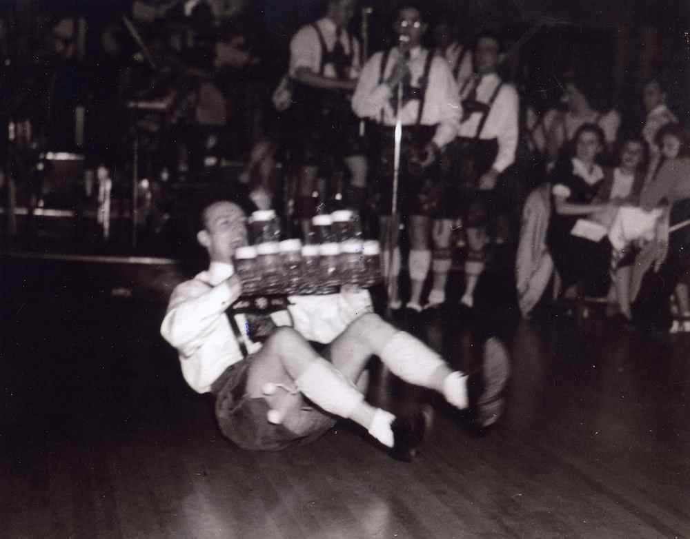 Pirchner's signature act involved balancing many beer-filled steins as he ran across the restaurant's stage, went into a slide like a baseball player, and slid off the stage as he landed on his feet again. | Source: Cleveland Memory, Cleveland State University Library Special CollectionsDownload Original File