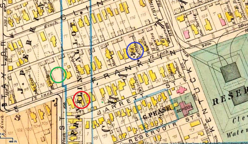This section of the 1881 City of Cleveland map reveals the array of fine houses and mansions that lined Franklin Avenue between Kentucky (West 38th) Street and Harbor (West 44th Street) Maria Bartow's home at 4211 is circled in red. Above and to the left, circled in green, is the lot where Hannes Tiedemann was preparing to build Franklin Castle, which was constructed between 1881-1883. To the right and above, circled in blue, is the mansion of Henry Coffinberry, one of Cleveland's prominent early industrialists. Also seen on this map to the right is the Kentucky Street Reservoir, Cleveland's first reservoir. It was built in 1853 and served famously as the site of promenade walks for the west side's elite.