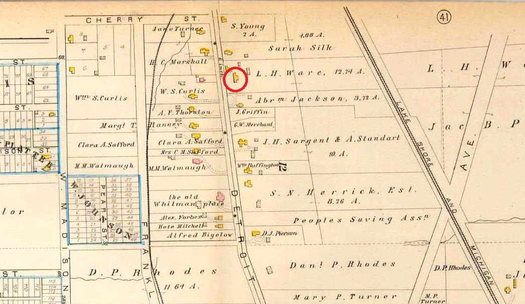 This section of the 1881 Plat Map of West Cleveland shows the Detroit Street location of the Samuel White Roadside Inn (circled), which by this date was now the residence of Liberty H. Ware. In this year, Ware was completing his first term as Mayor of West Cleveland. The village's town hall was also located on Detroit Street, just about a quarter mile east of Liberty's house.