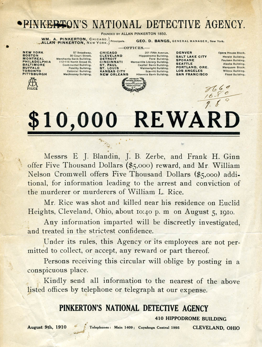 Reward Poster, ca. 1910 ID: 6411 | This file appears in: Euclid Heights Allotment The murder of William Lowe Rice, walking home one evening from the Euclid Club in 1910, was never solved, but his law partners offered this reward for information through the famous Pinkerton Detective Agency. Image courtesy of William C. Barrow Download Original File "Reward Poster, ca. 1910" appears in: Euclid Heights Allotment