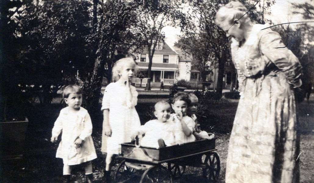 In this circa 1920 photograph, five grandchildren of Ida Stuhr visit her at Needham Castle. From left to right are: Herman, Freida, Frederick, Maria and Charles. The street in the background is Detroit Avenue, at the 5900 block, as it appeared that year. | Date: ca. 1920 | Source: Nancy T. SchreinerDownload Original File