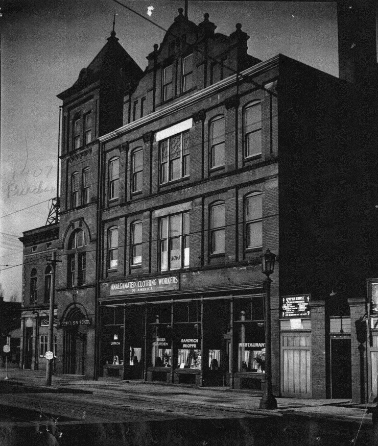 Built in 1890 by wealthy Hungarian-American Theodore Kundtz, it was originally known as Hungaria Hall. Purchased by a group of Czech societies in 1907, the building was renamed Ceska Sin Sokol Hall, although for years thereafter many still called it "Hunkie" Hall. This photo taken in circa 1934 shows the the hall at a time when a restaurant operated out of the first floor store-front and the Amalgamated Clothing Workers of America, which had just unionized the Joseph & Feiss Company on West 53rd, had an office on the second floor. | Source: Gilbert BachnaDownload Original File