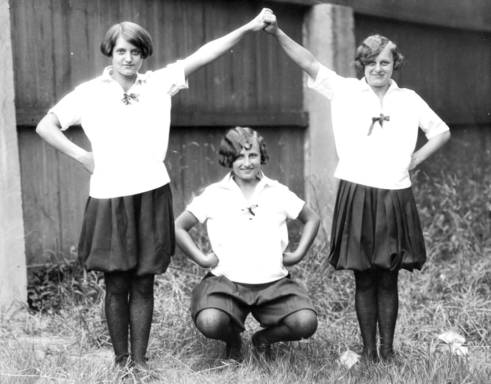 Three members of the Nova Vlast Sokol girl's team--Adeline Stedronsky (17), Elsie Bohdal (15) and Martha Chaloupka (14), pose at the August 7, 1927 Czechoslovakian Festival, held on the grounds of Ceska Sin Sokol Hall. The festival was sponsored by several Czech and Slovak American organizations to promote solidarity between the two ethnic groups.