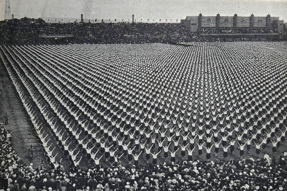 Beginning in 1882, on the twentieth anniversary of the founding of the Czech Sokol Society, large festivals--called "slets," were periodically held at stadiums in the city of Prague. The above photo is of the 1932 Sokol Slet held in Strahov Stadium. There, crowds of up to 135,000 visitors watched 15,000 gymnasts perform complex and synchronized routines over the course of the 17-day festival.