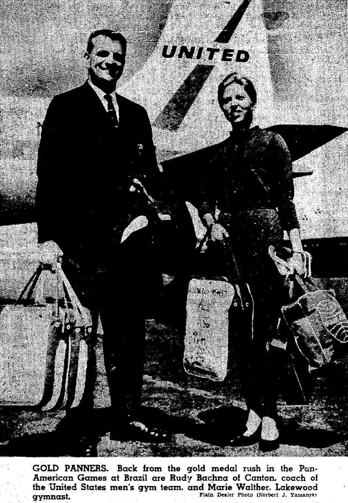 Rudy Bachna founded the gymnastics program at Kent State University in 1959 and served as head coach until his retirement in 1991. Over the course of these 32 years, his teams compiled a record of 262-103-1. His program at Kent State became a model for college gymnastics across the United States. In the 1960s, Bachna coached two women to gold medals at the Pan American games. He is shown in the 1963 photograph above returning from the Pan American Games with one of those two gymnasts, Marie Walther.