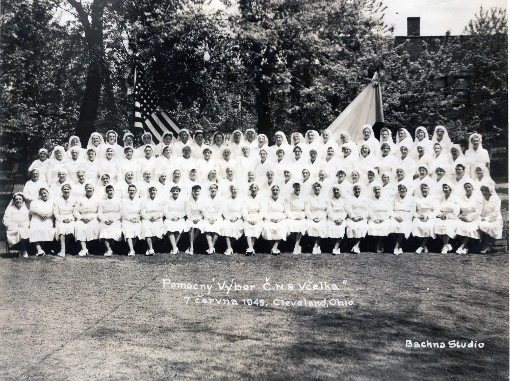 An auxiliary committee of a Czechoslovak women's society poses for a picture on the grounds of Ceska Sin Sokol Hall in 1945. Prior to 1958, there were extensive wooded grounds--often referred to as the garden, immediately to the east of the Hall. In that year, the land was sold to People's Savings and Loan Association which built a building and parking lot there, effectively eliminating the garden grounds.
