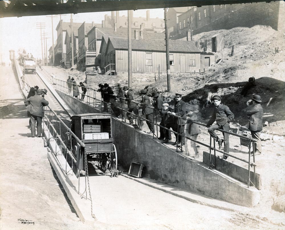 The starting point for the Rolling Road was at the base of Eagle Avenue, at Canal Road, where the loaded wagons were attached to the underground cable and its team of horses unhitched and led up the hill separately. The wagons would proceed at a speed of approximately 3 mph. | Source: Faragher Collection, CSU Library Special Collections