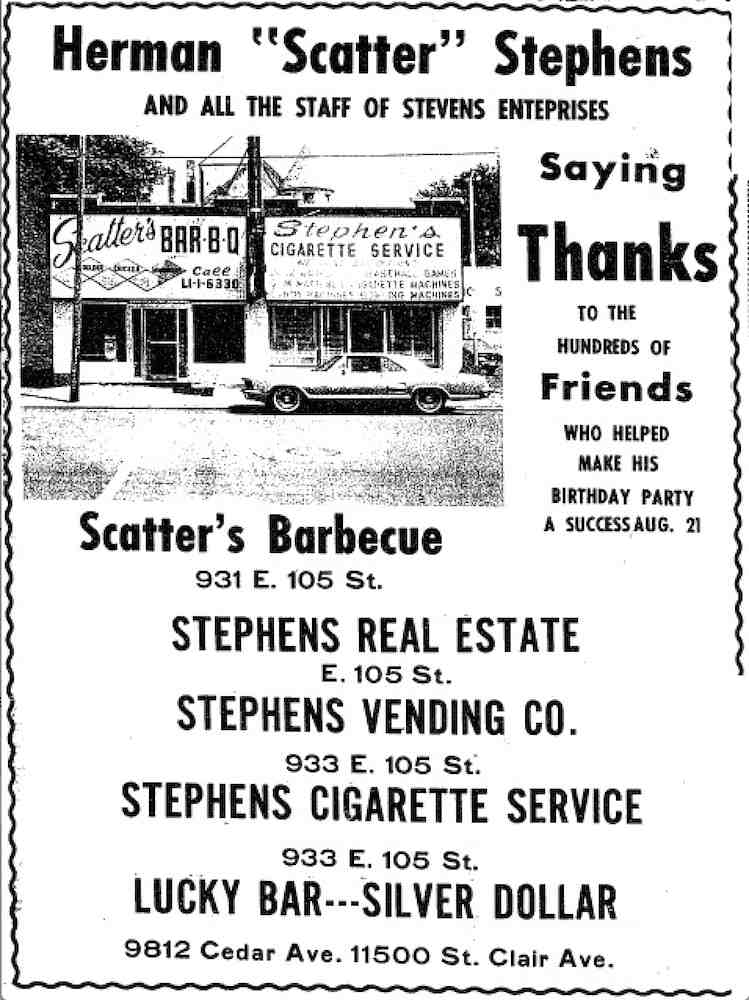 Initially Scatter's storefront was located at 931 East 105th Street, with a couple of modest signs advertising "Scatter's Red Hots Barbecue." As Scatter's Barbecue grew, he took over the rest of the building in the former Silk Top Barber Shop and opened his cigarette & vending service and realty companies at 933 East 105th. As the years progressed, his signs expanded to cover the brick front.