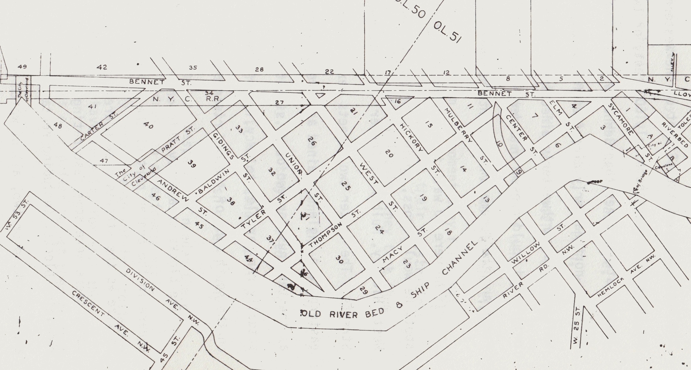 This map shows the street layout on Whiskey Island in the mid-1800s, when an Irish neighborhood was located there. The Irish moved out towards the end of the nineteenth-century. The space they vacated was quickly filled with more industry.