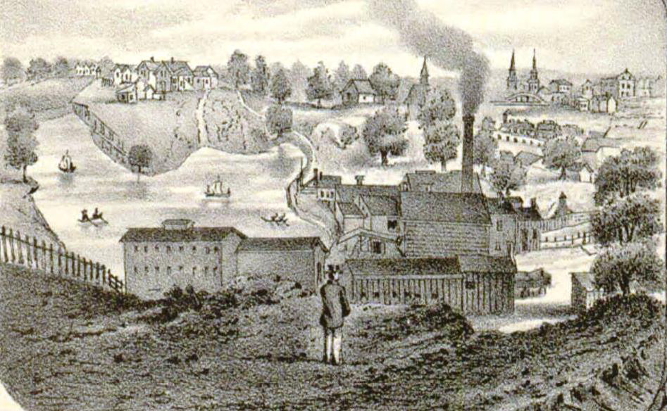 This idealized sketch of a slaughterhouse located north of Scranton Road near the Walworth Run's mouth appeared in the 1874 Cleveland Atlas. In the nineteenth century, the Run was dammed at a number of locations along its length to create mill ponds which were used for commercial and then later industrial purposes. | Source: Cleveland Public Library, Digital Map Collection.Download Original File