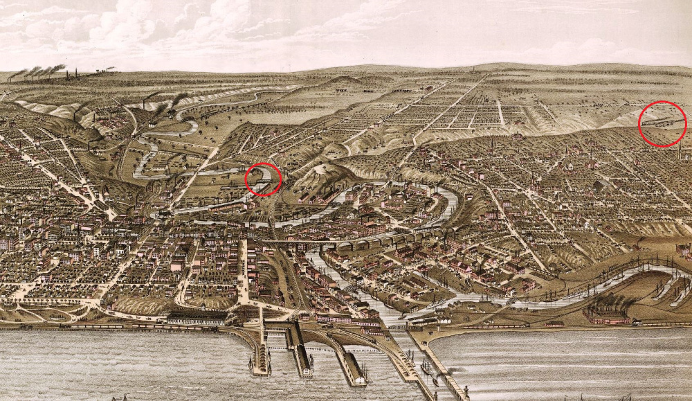 The 1877 Bird's Eye View of Cleveland was drawn with amazing detail. The two red circles that have been superimposed upon this section of that map identify the location of the Walworth Run on the west side of Cleveland. The circle on the left is the approximate location of the mouth of the Run on the Cuyahoga River, while the circle on the right marks the location of the Run at approximately West 44th Street near the Big Four railroad tracks.