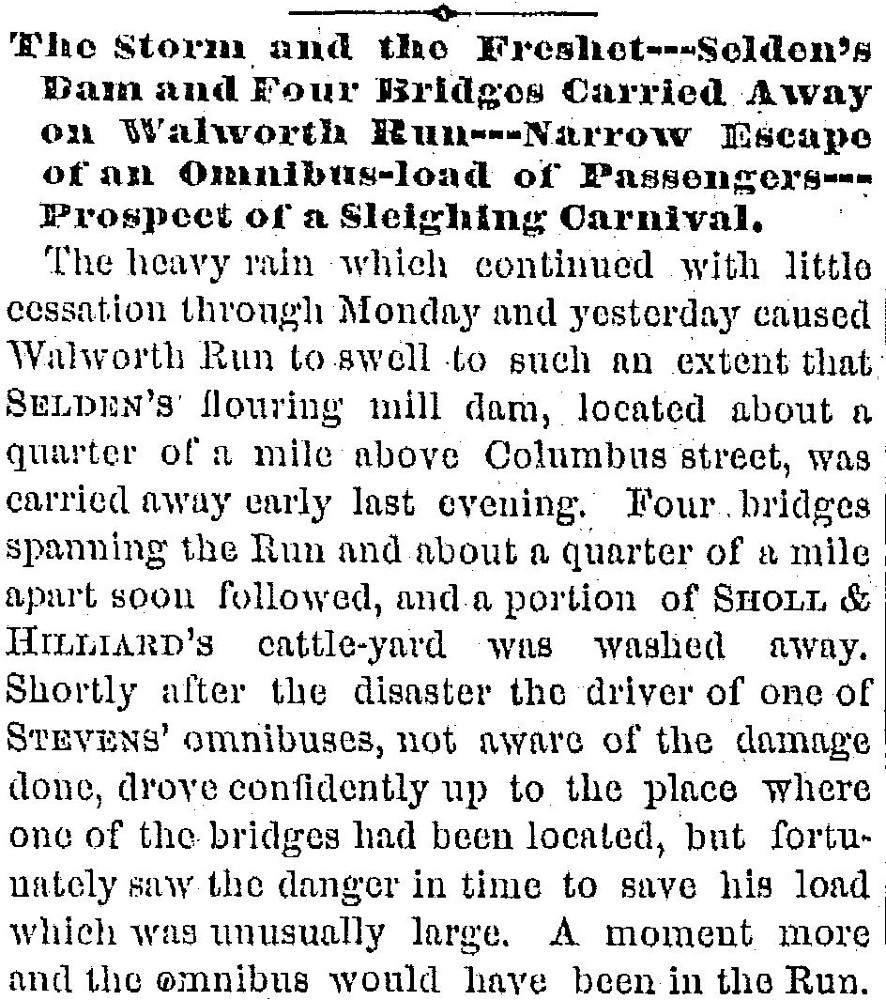 In early December 1859, a heavy rainstorm caused the Walworth Run to swell, overflow, and washout a dam, four bridges and part of a nearby slaughterhouse operation. While normally a slow-moving little stream, during rainstorms like this one which occurred periodically, the Run often destroyed buildings and other man-made structures in its way, washing them downstream into the Cuyahoga River.