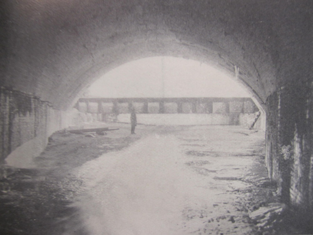 As the Walworth Run Sewer approached the Cuyahoga River, its design was altered to produce a specific desired rate of flow into the latter river. The pipe diameter at the outlet was essentially flattened, as shown in the 1905 photo above, so that it was fifty feet wide, but only fourteen feet high. The structure seen in the distance is the Erie (later, "Nickel Plate") Railroad Trestle