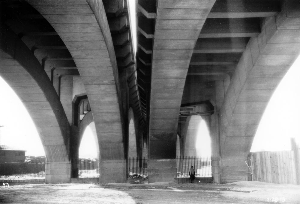 This view of the underside of the massive Holton Avenue Bridge affords a vastly different perspective than that seen daily by RTA riders. | Source: Cleveland & Youngstown Railroad Collection, Cleveland State University Library Special CollectionsDownload Original File