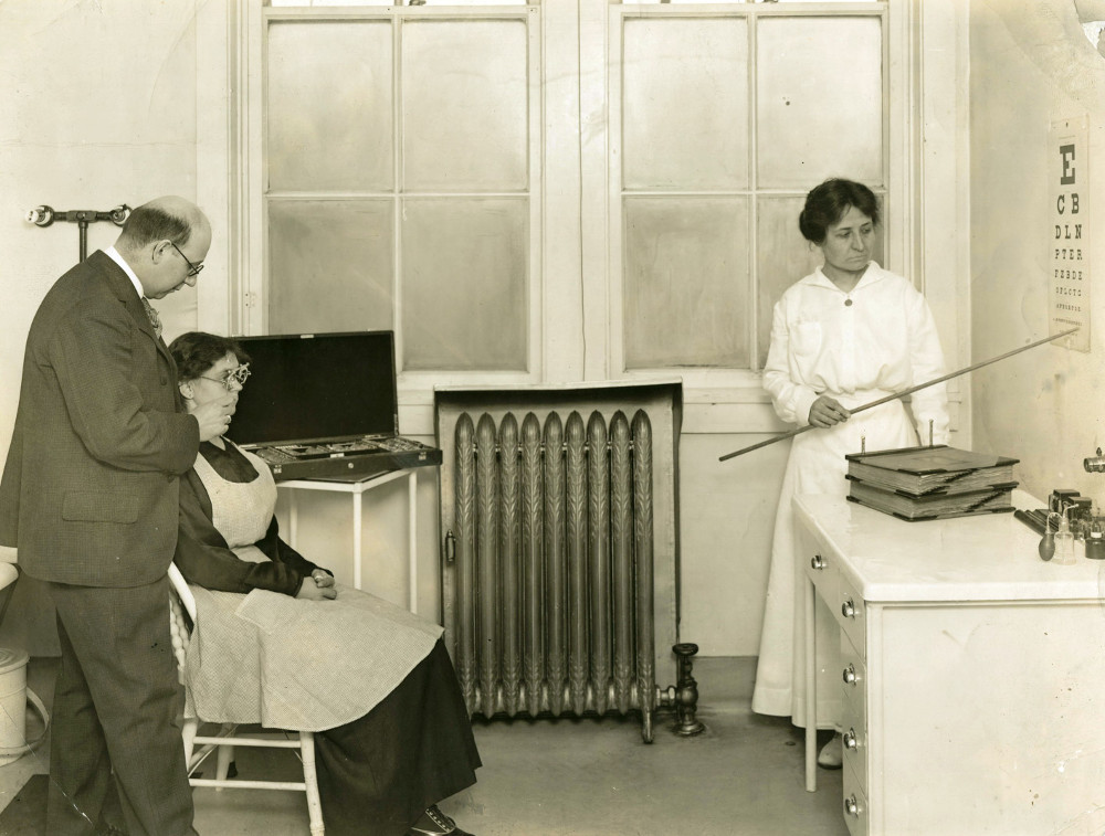 Among the Progressive programs at Joseph & Feiss in the early twentieth century was free employee health care. In this 1915 photo, Dr. Monson and Nurse Krebs administer a vision test to employee Mary Uhlic at the company's offices on West 53rd St.
