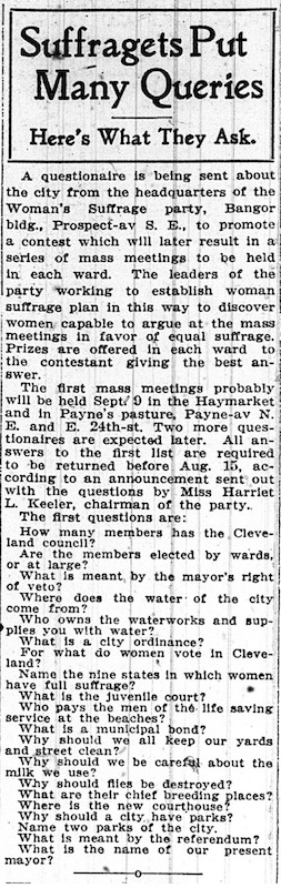 | Source: "Suffragettes Put Many Queries." The Cleveland Plain Dealer, August 4, 1913.