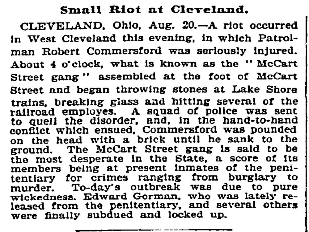 On August 21, 1894, the New York Times took note of the McCart Street Gang, publishing this article about a "battle" that took place between Cleveland police and the Gang that same date. It called the Gang " the most desperate in the State."