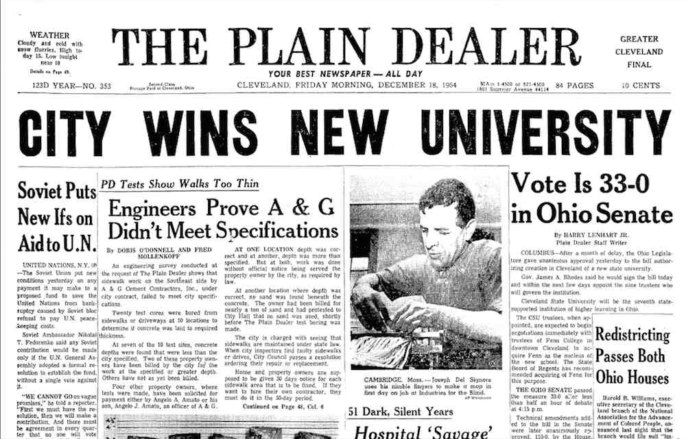 Although House Bill No. 2 enjoyed wide margins of victory in both the House and Senate considerable resistance to Cleveland State's establishment still existed. Other universities feared losing prospective students and state funds, there were concerns about the stability of Fenn's campus as the school's nucleus, and many felt CSU should be located outside the city where land was cheaper. | Date: December, 18 1964 | Source: Plain Dealer, December 18, 1964Download Original File
