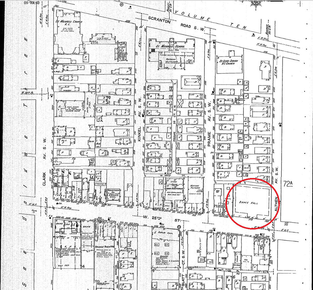 This 1953 Sanborn Insurance Map shows the location of the Aragon Ballroom on Cleveland's near west side, a neighborhood today known as Clark-Fulton. In the Ballroom's heyday in the 1930s and 1940s, the Clark Avenue Trolley line would back up weekend evenings because so many Clevelanders were taking the trolley to the Aragon.