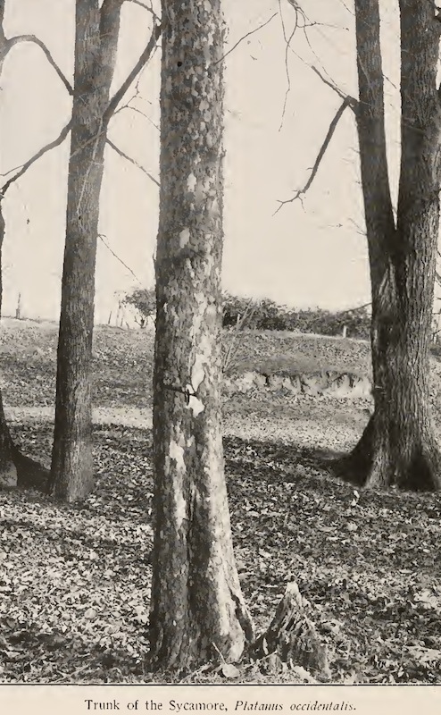 The distinguishing peculiarity of the Sycamore is that it "casts its bark as well as its leaves." All trees do this more or less, it is a necessity of life that the bark should yield to the pressure of the growing stem; and the outer layers becoming dead fall off in scale or plates of varying size...but the Sycamore proclaims the fact more openly than any other tree of the forest. The bark of the trunk and larger limbs flakes off in great irregular masses leaving the surface mottled, greenish white and gray and brown, sometimes the small limbs look as if whitewashed. In winter it can be recognized from afar by this characteristic alone; and as it likes to grow upon river banks the course of the stream may often be traced for a long distance by the white branches of this tree. The explanation of this is found in the rigid texture of the bark tissue, which entirely lacks the expansive power common to the bark of other trees, so that it is incapable of stretching to accommodate the growth of the wood underneath and the tree is obliged to slough it off. | Source: Keeler, Harriet L. Our Native Trees and How to Identify Them. 3rd ed. New York: Charles Scribner's Sons, 1902. 265-266. Print.Download Original File