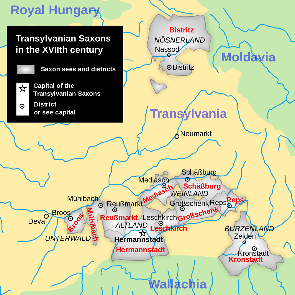 This seventeenth century map shows the areas of Transylvania which were settled by Saxon immigrants from Germany beginning in the twelfth century. The original Saxon towns, which gave rise to the Saxons calling their land Siebenburgen ("Seven Towns") were: Bistritz, Kronstadt, Klausenburg, Mediasch, Seh besh', Hermannstadt, and Schassburg. | Source: WikipediaDownload Original File