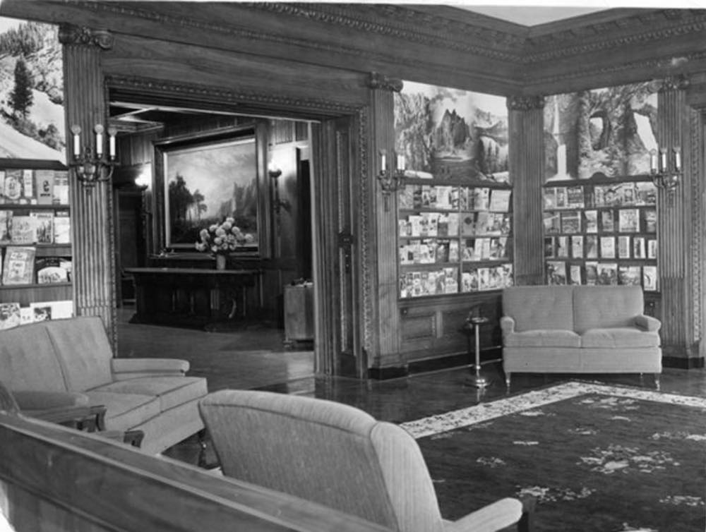 From 1940 to 1967, Mather Mansion served as the location of the Cleveland Automobile Club. In this photo, the house's wood paneling is covered with travel photos and racks of tourist brochures and maps. Founded in 1900, the Club was the second automobile club founded in the United States. Upon the sale of the mansion to Cleveland State University the club moved to a new headquarters on South Marginal Road, where it remains today as the Ohio Motorists Association. | Source: Cleveland State University Library Special CollectionsDownload Original File