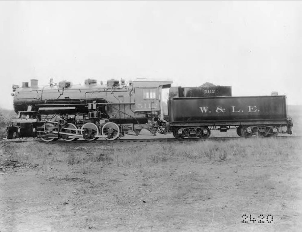 The Wheeling & Lake Erie steam locomotive #5112, shown here in Massillon, Ohio, in 1905, was of a type that had a wheel configuration of 0-8-0, which was typical of locomotives available in the early 1900s. | Source: Wheeling and Lake Erie Railroad Collection, Cleveland State University Library Special CollectionsDownload Original File