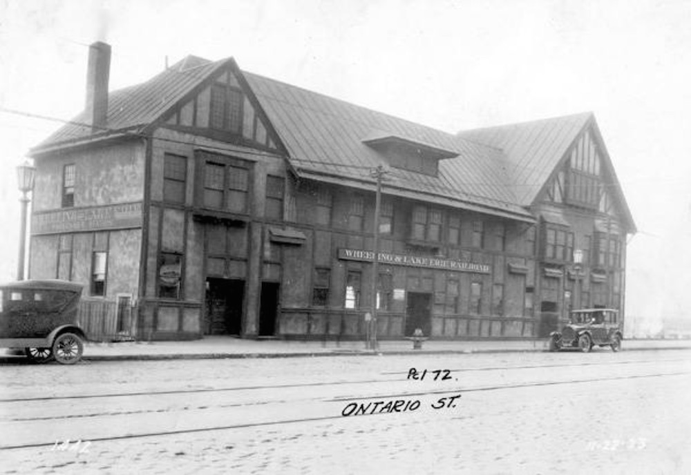 The Wheeling and Lake Erie depot was located at 2260 Ontario Street in downtown Cleveland. This Tudor-style building was constructed as a "temporary" structure to replace the previous depot, which had been deemed unsafe. The depot was used from April 1, 1909, to January 25, 1929. | Source: Wheeling and Lake Erie Railroad Collection, Cleveland State University Library Special CollectionsDownload Original File
